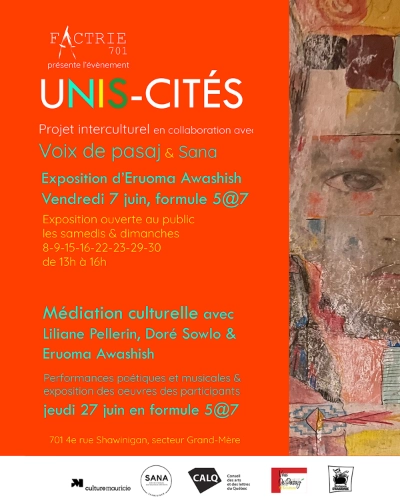 Ateliers de médiation culturelle. Exposition d'Eruoma Awashish, Vernissage le 7 juin en formule 5 à 7. Soirée performances musicales et poétique, et exposition des participants le 27 juin en formule festive 5 à 7.